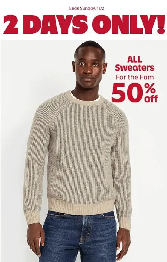 Save big now! Shop in store and get 50% off all sweaters for the family.